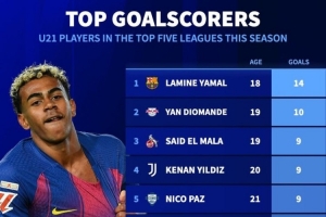 五大联赛U21球员联赛进球榜:亚马尔14球居首 扬·迪奥曼德第二