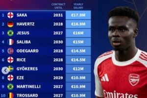 阿森纳队内年薪榜:萨卡1790万欧居首,哈弗茨次席,热苏斯第三