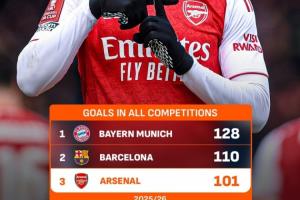 据LiveScore统计,阿森纳成为本赛季欧洲五大联赛第三支达成百球里程碑的球队,仅次于拜仁和巴萨。